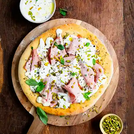 Crème fraiche, mortadella, stracciatella, pistachio, mozzarella, olive, oregano