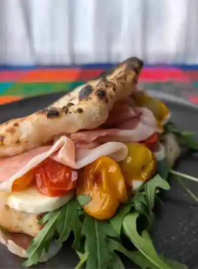 Straciatella, Parma ham, arugula, cherry tomatoes, pesto, olive oil