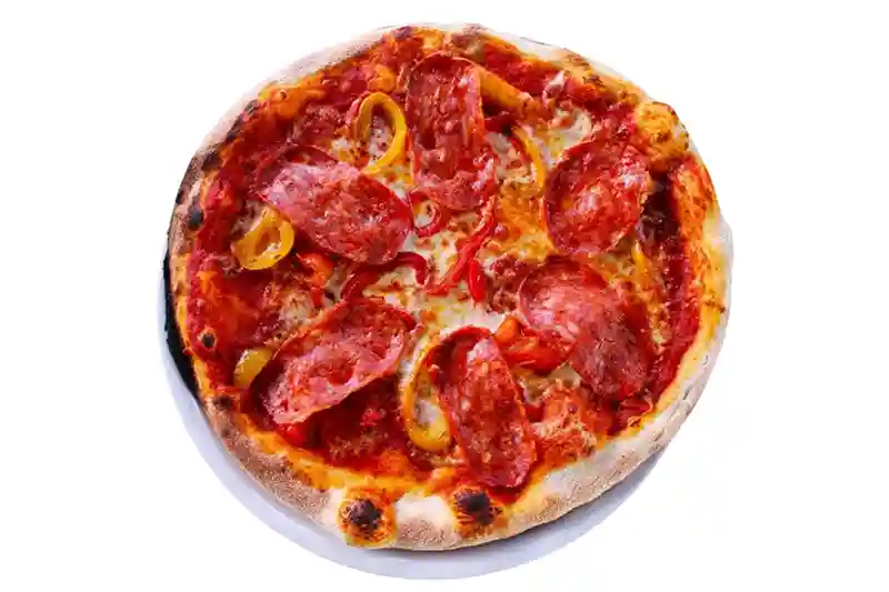 Tomato Sauce, Pepperoni, Bell Pepper, Onion, Espelette Pepper, Mozzarella, Olive, Oregano