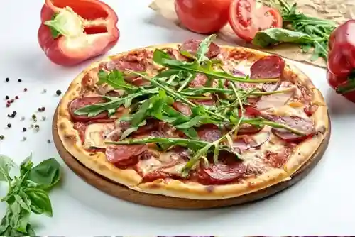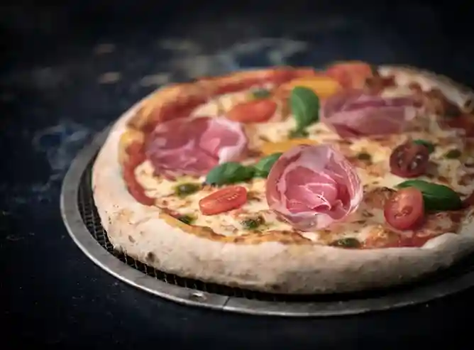 Tomato Sauce, Italian Raw Ham, Cherry Tomato, Arugula, Parmesan, Pesto, Mozzarella, Olive, Oregano