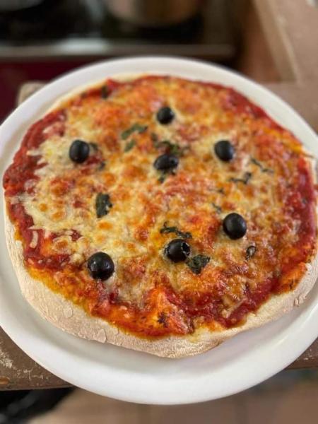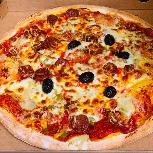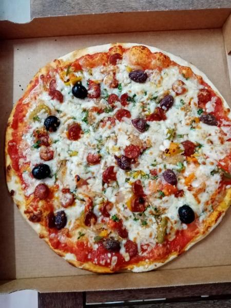 Tomato sauce, Mozzarella, Merguez, Onions, Pepper, Olives