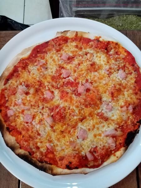 Tomato sauce, Fresh cream, Mozzarella, ham, Egg, Mushrooms, Parsley