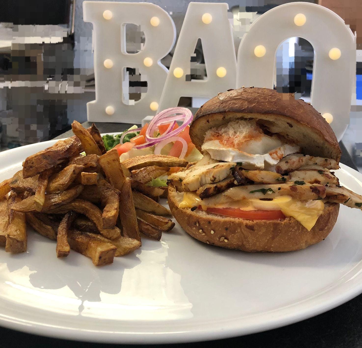 Chicken Bruger, Caramelized Onions, G...