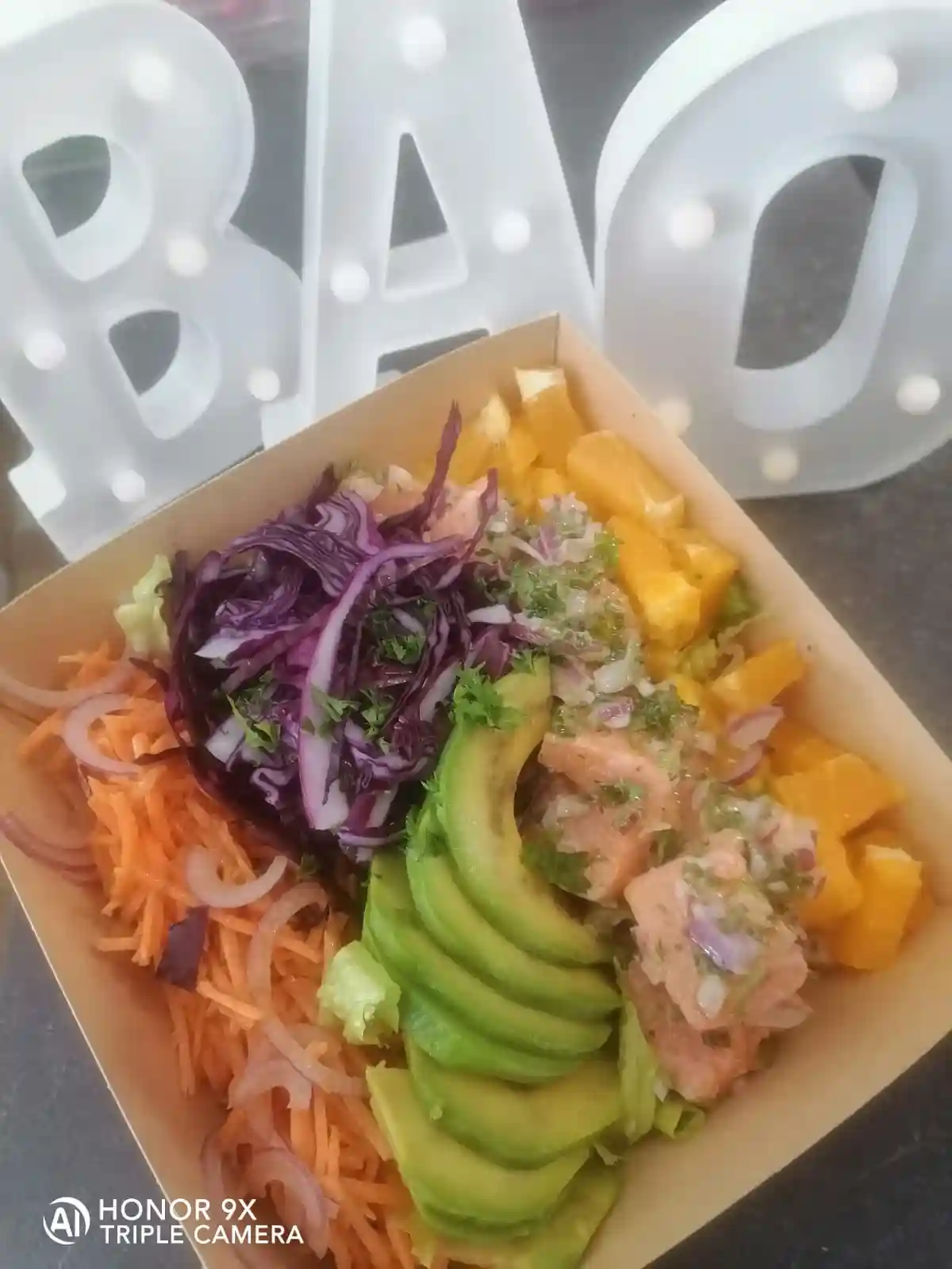 Salad, Shredded carrots, Avocado, Salmon, Red cabbage