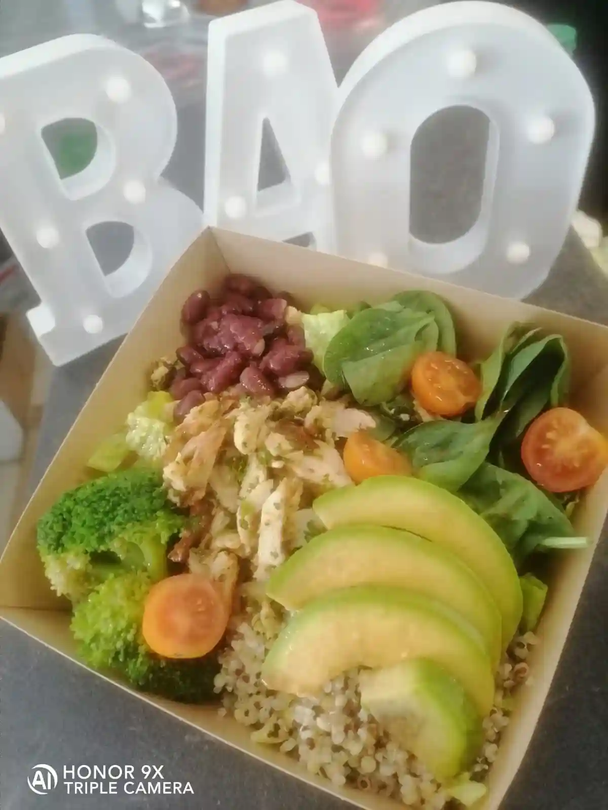 Spinach, Avocado, Kidney beans, Broccoli, Quinoa curry Chicken, Olive oil, Sherry vinegar
