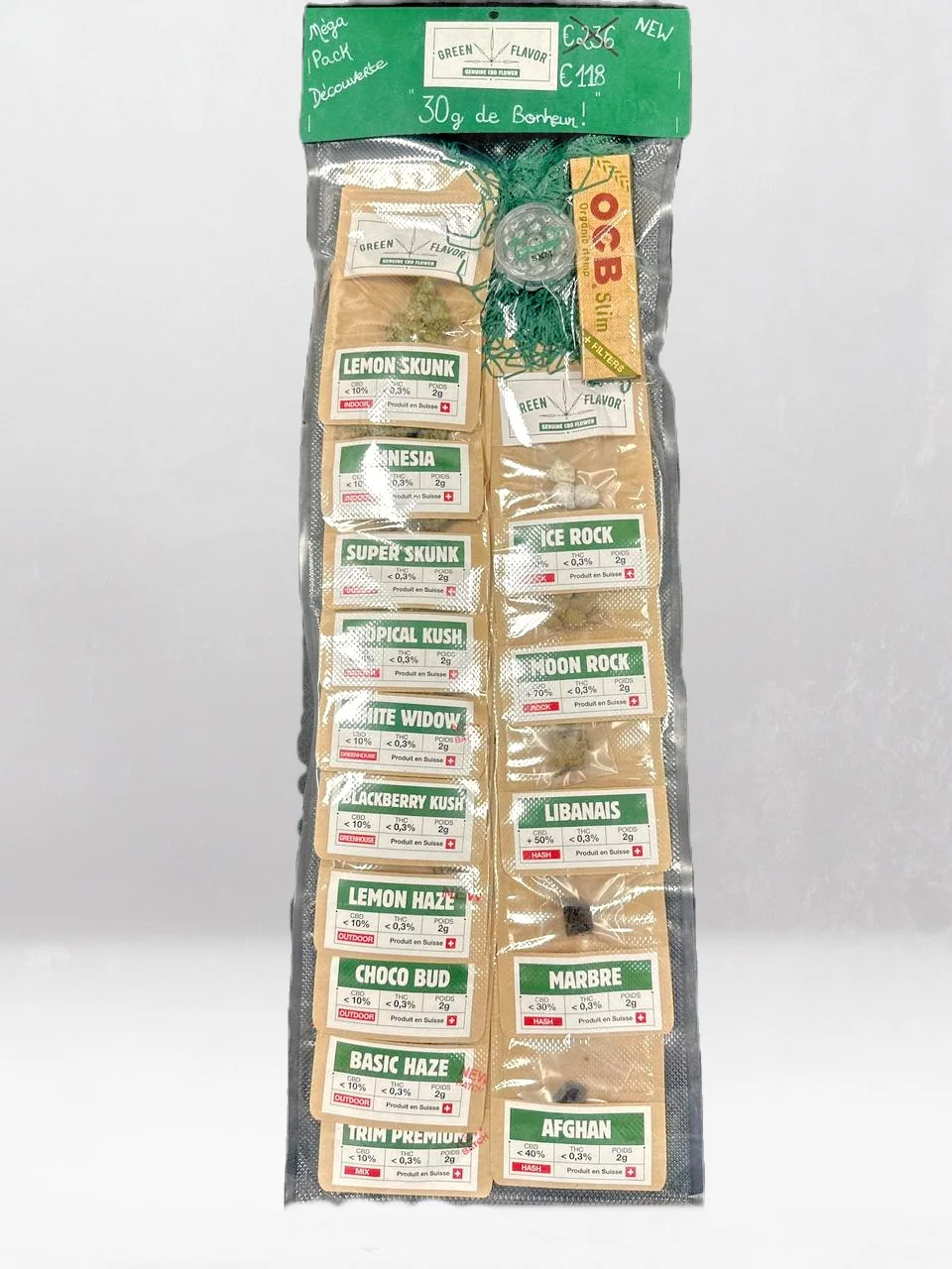 30g of Happiness at 50% off! All our varieties in 14 packs of 2g. Ideal for the pleasure of tasting everything! 2g CBD Trim Premium Flower, 2g CBD Basic Haze Flower, 2g CBD Choco Bud Flower, 2g CBD Lemon Haze Flower, 2g CBD Gelato Flower, 2g CBD Tropical Kush Flower, 2g CBD Super Skunk Flower, 2g CBD Amnesia Flower, 2g CBD Lemon Skunk Flower, 2g CBD Marble Resin, 2g CBD Afhgan Resin, 2g CBD Lebanese Resin, 2g Moon Rock, 2g Ice Rock, Pack of OCB leaves, Green Flavor SXM grinder, Lighter, Reusable charcoal filters.