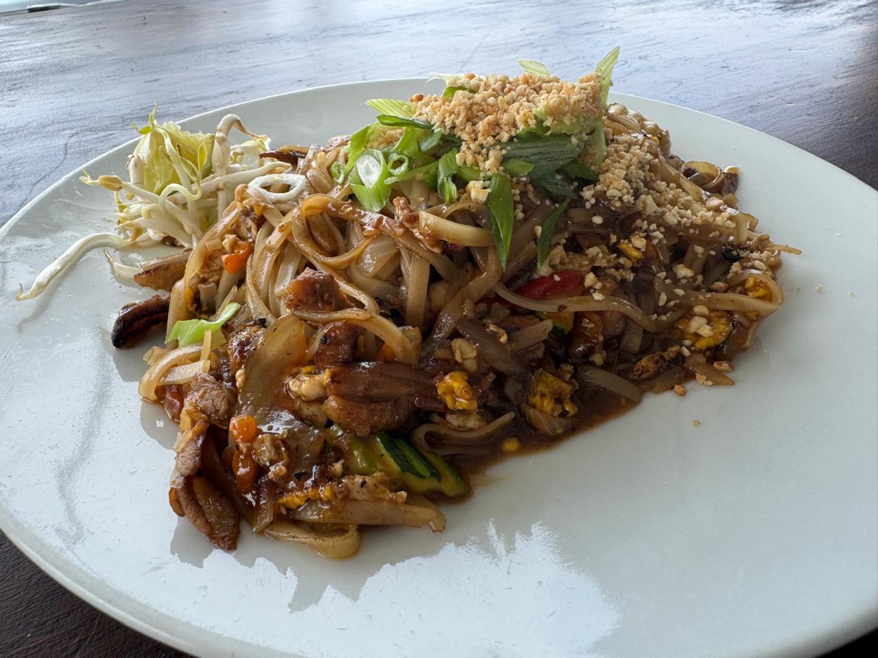 Rice Noddles Fried with Vegetables, Egg, Tamarin Sauce, Peanuts, Soy Sprouts