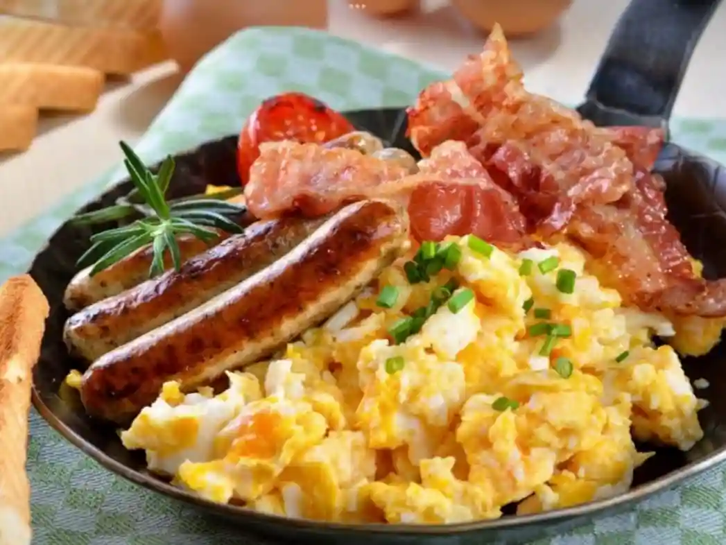 French toast with banana and blueberry, Caramel sauce, Fried egg & bacon, Orange juice, Butter & jam, Pastry & French...