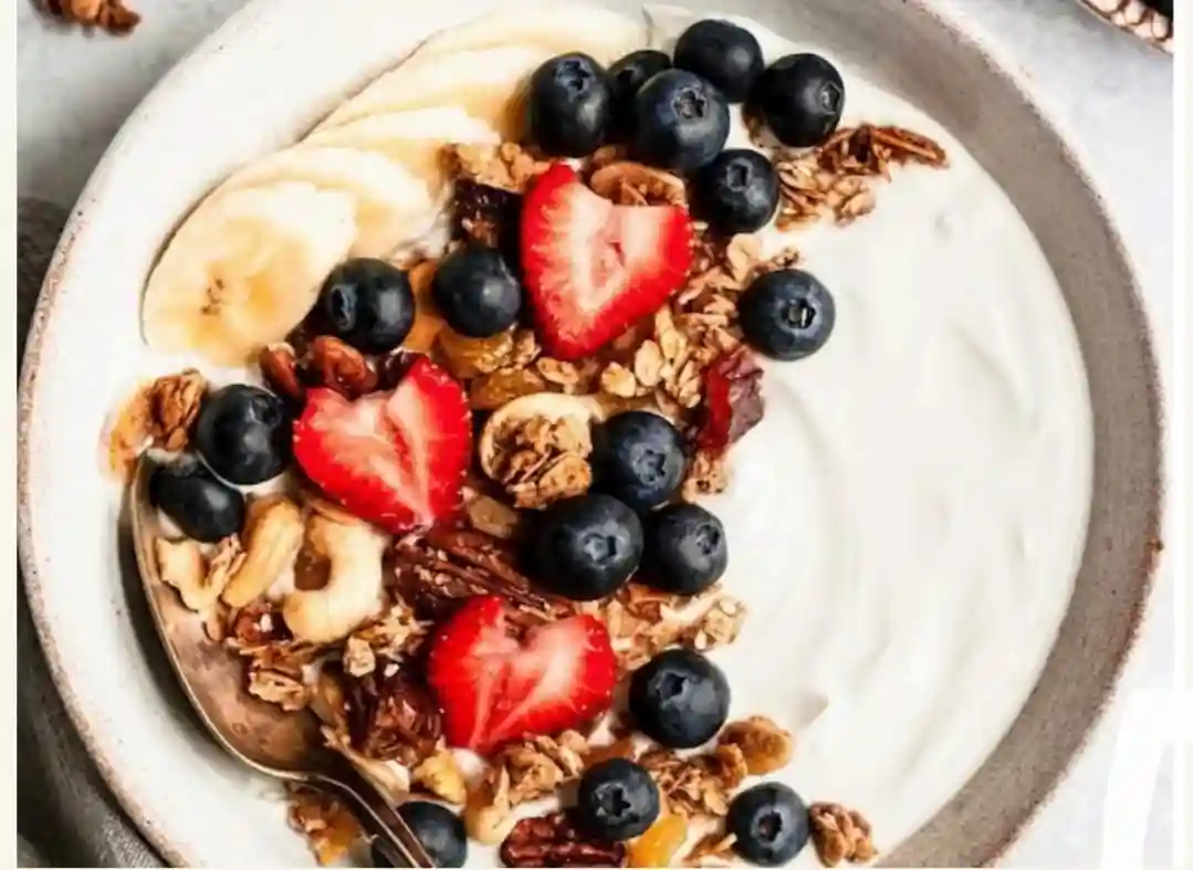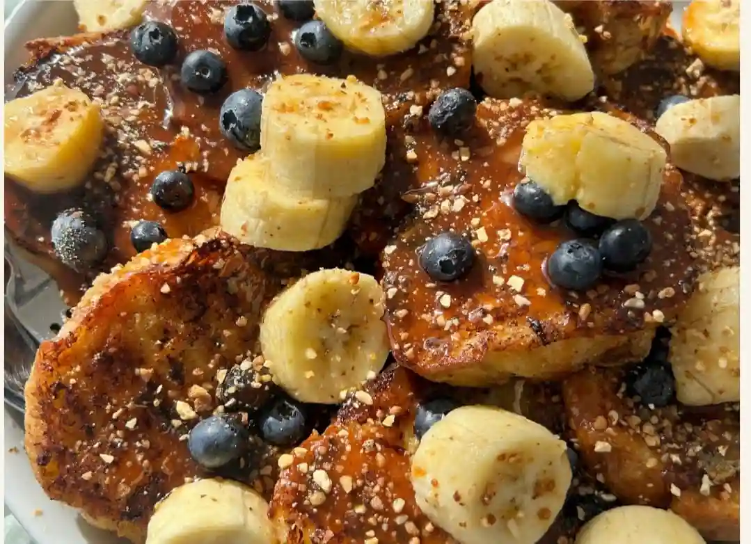 French toast with banana and blueberry, Caramel sauce, Fried egg & bacon, Orange juice, Butter & jam, Pastry & French bread, Fruit platter, Coffee & tea bag