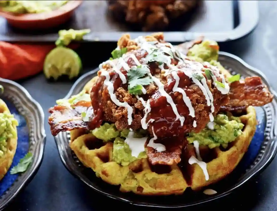Fried Chicken waffle, Avocado, Cheddar, Sweet n' sour sauce, Pickles, Brioche French toast, Caramel sauce, Scrumble e...