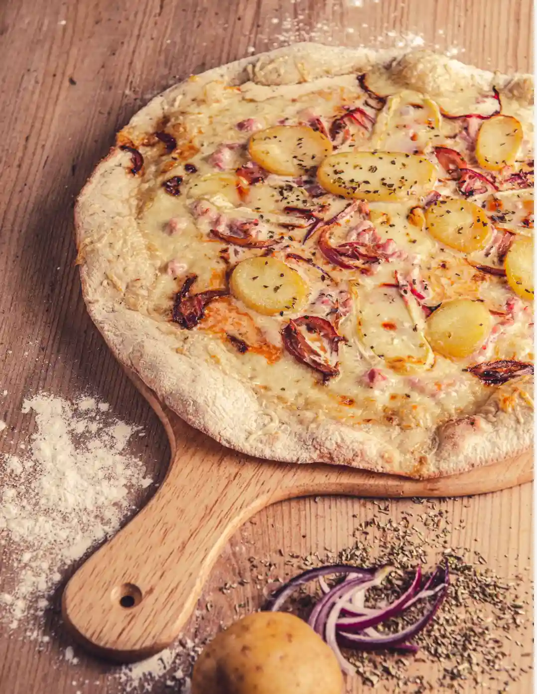 Cream, mozzarella, reblochon cheese, bacon, potatoes, caramelized onions, oregano