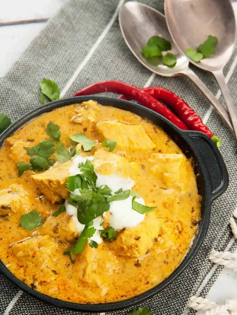 Tender chicken cooked in a fragrant, creamy gravy made with yogurt, nuts, and aromatic spices, offering a mild yet ri...