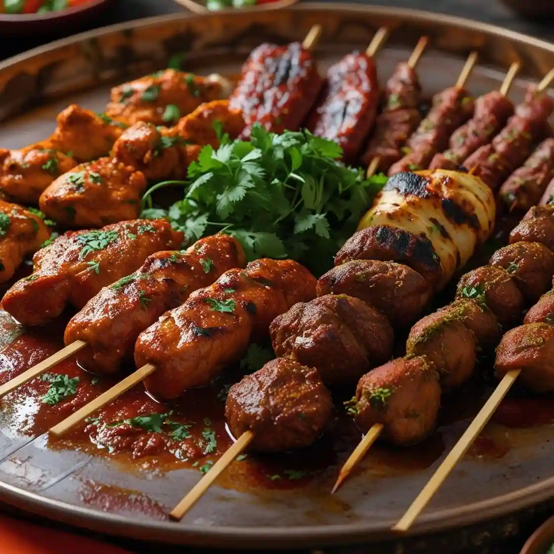 A Mouthwatering Selection of Marinated Meats—Chicken, Lamb, and more—Grilled to Smoky Perfection, Offering a Rich Bur...