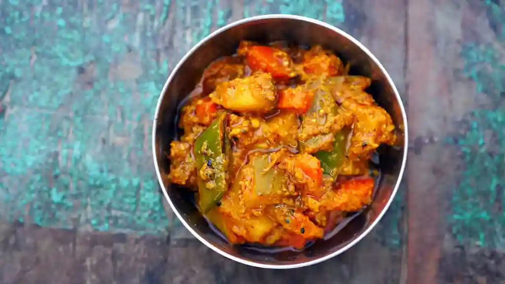 A fiery and tangy curry with tender mutton, packed with bold spices and vinegar, offering a bold, mouthwatering punch...