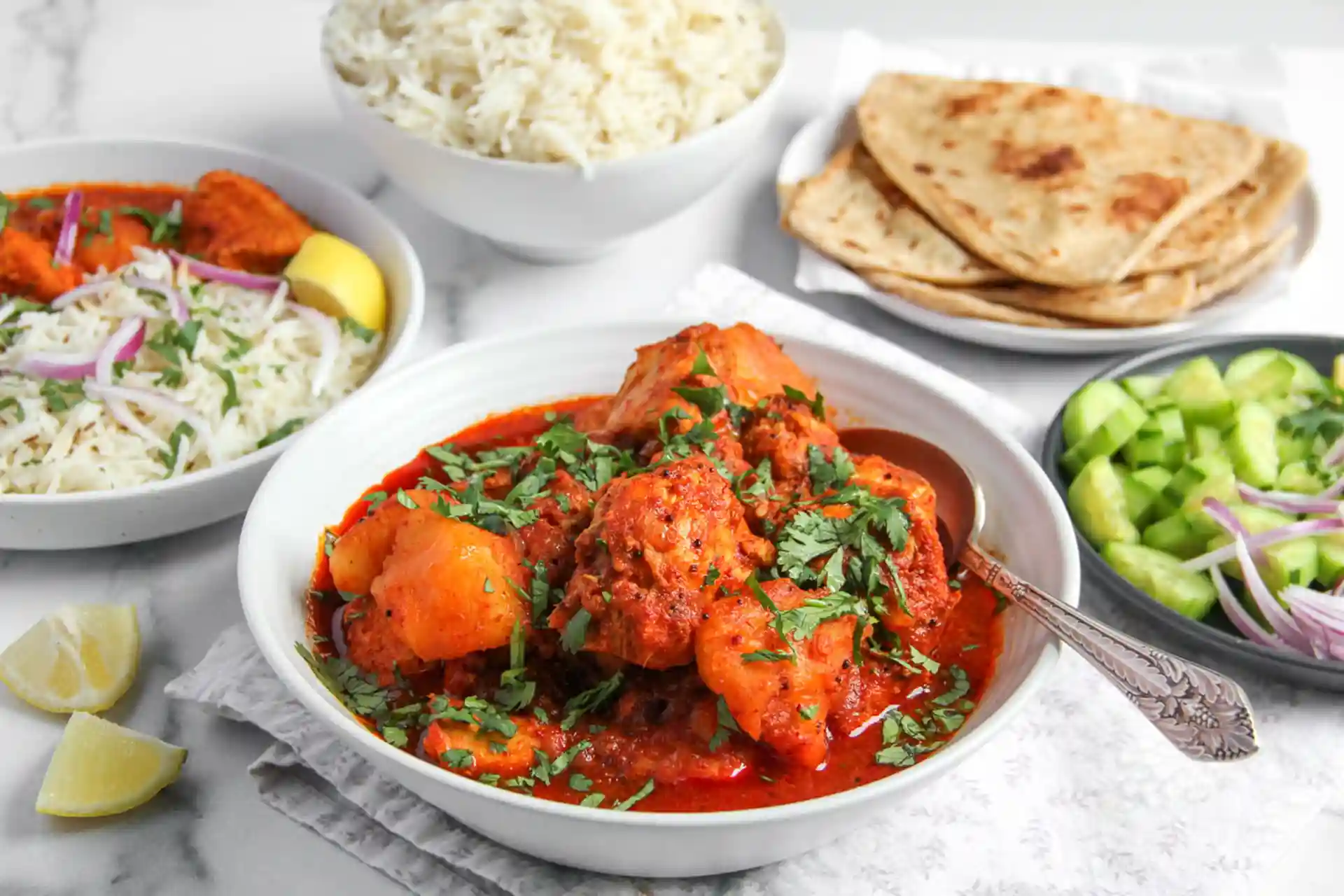 A fiery, tangy curry with tender chicken, packed with bold spices and a kick of heat, creating a flavorful and bold e...