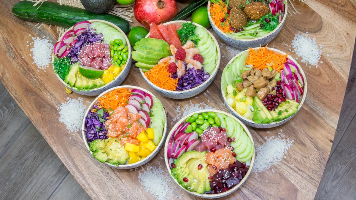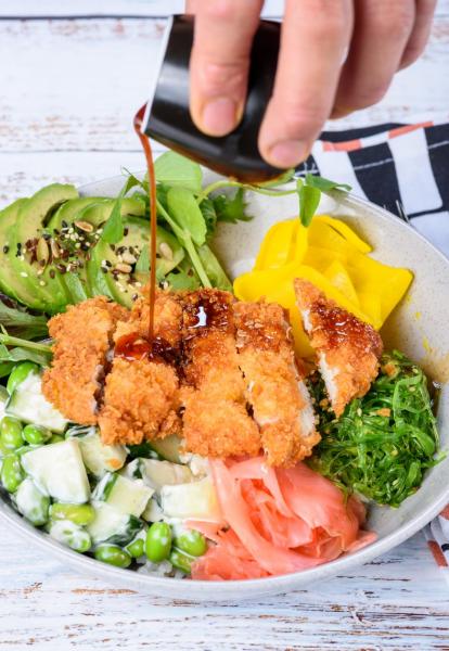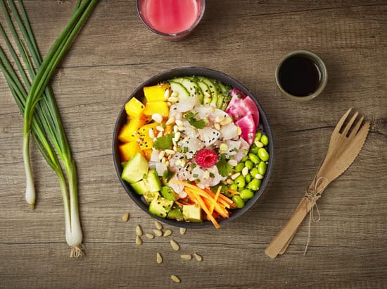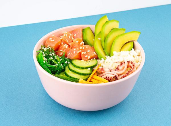 Salmon marinated in soy, Japanese cabbage salad, Avocado, Red onion, Kumato tomatoes, Cucumbers, Kaz à Poke sauce, Se...