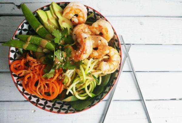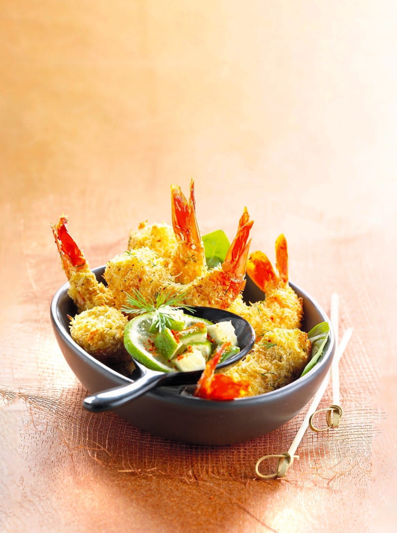 Grilled shrimps, Carrots, Guacamole, Cucumbers, Cherry tomatoes, Tuna cheese cream, Mango, Grated coconut