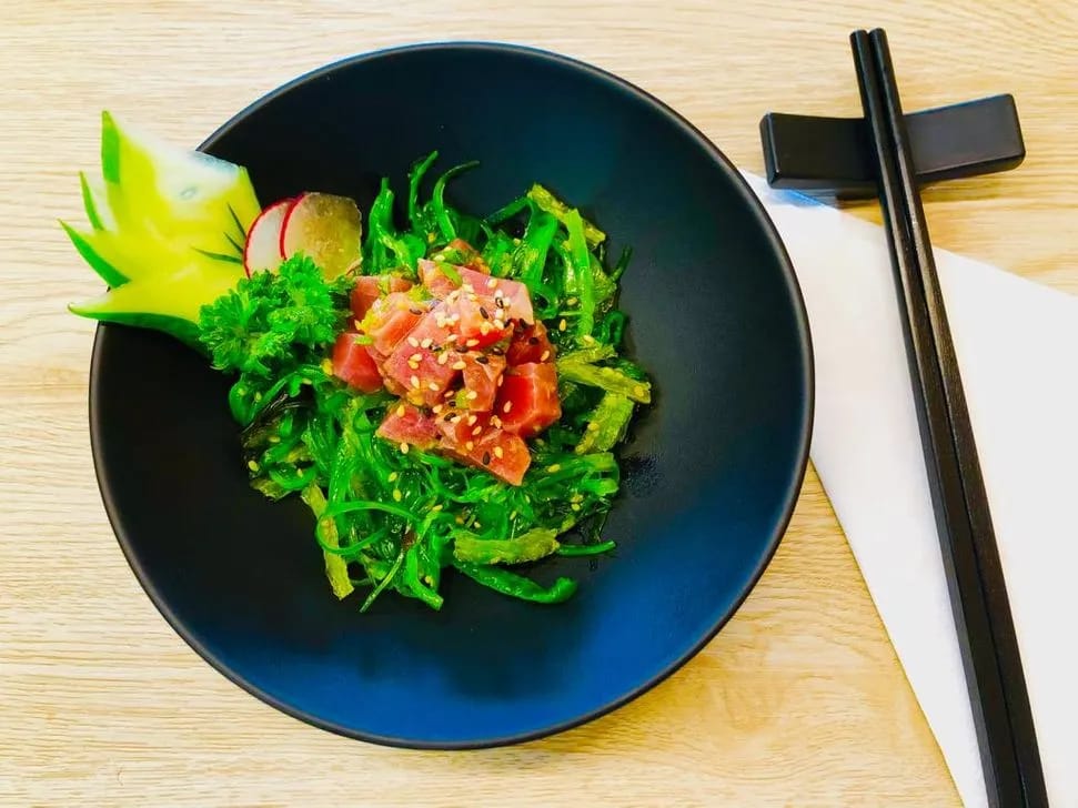 Tuna marinated in teriyaki, Marinated red cabbage, Wakame, Carrots, Avocado, Mango, Lemon cream cheese, Fried onions,...