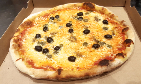 Tomato sauce, Anchovies, Capers, Mozzarella, Olives