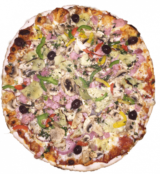 Tomato sauce, Ham, Artichoke, Peppers, Mushrooms, Mozzarella, Olives