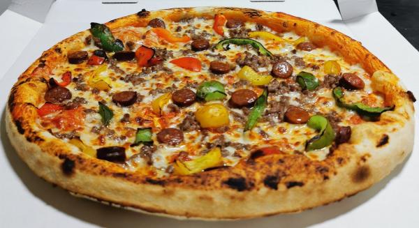 Tomato sauce, Merguez, Onions, Peppers, Mozzarella