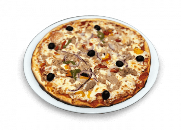 Tomato sauce, Tuna, Onions, Peppers, Mozzarella, Olives