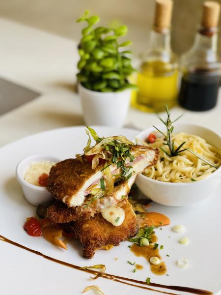 Homemade Traditional French Cordon Bleu, Linguinis and Vegetables