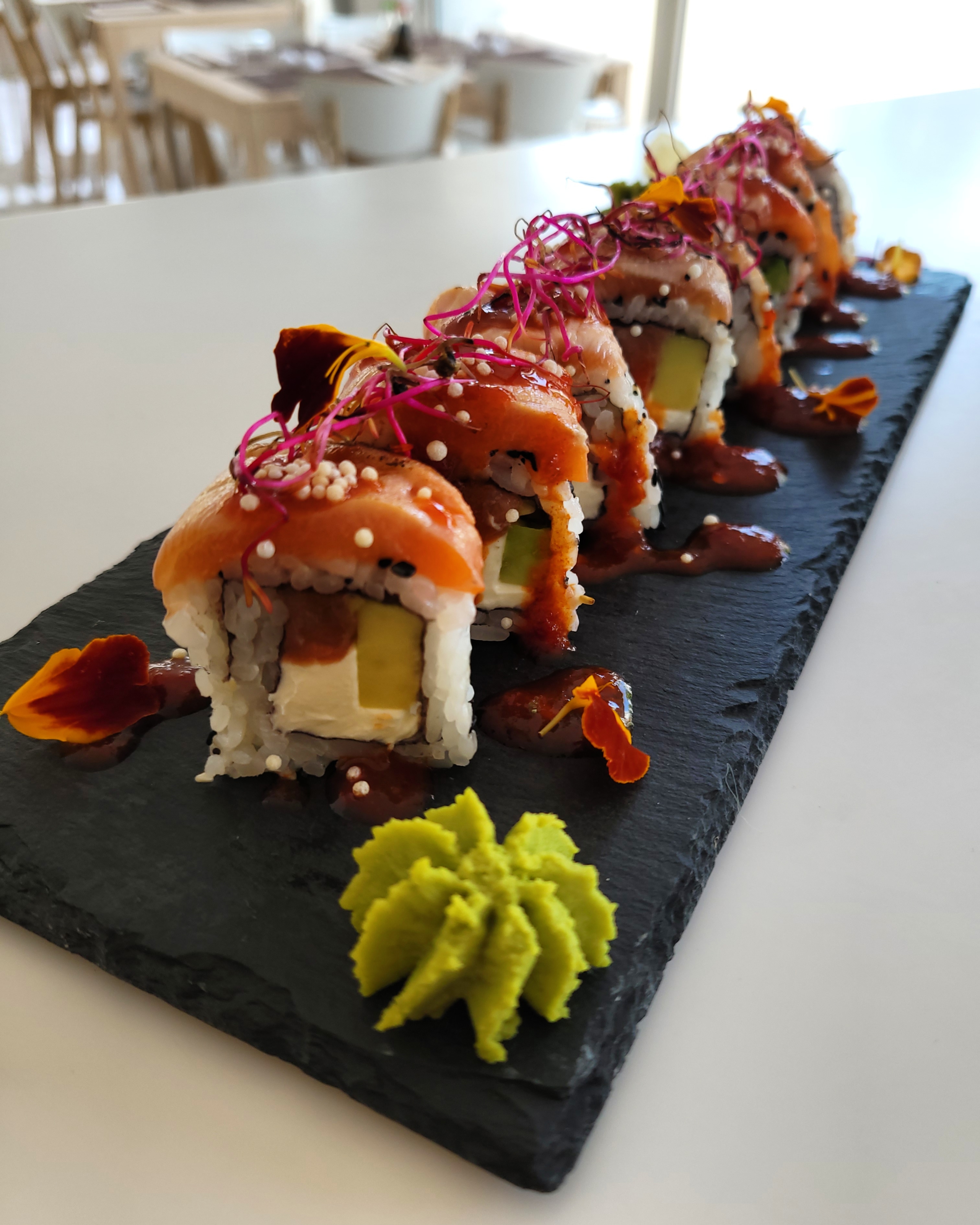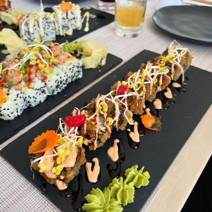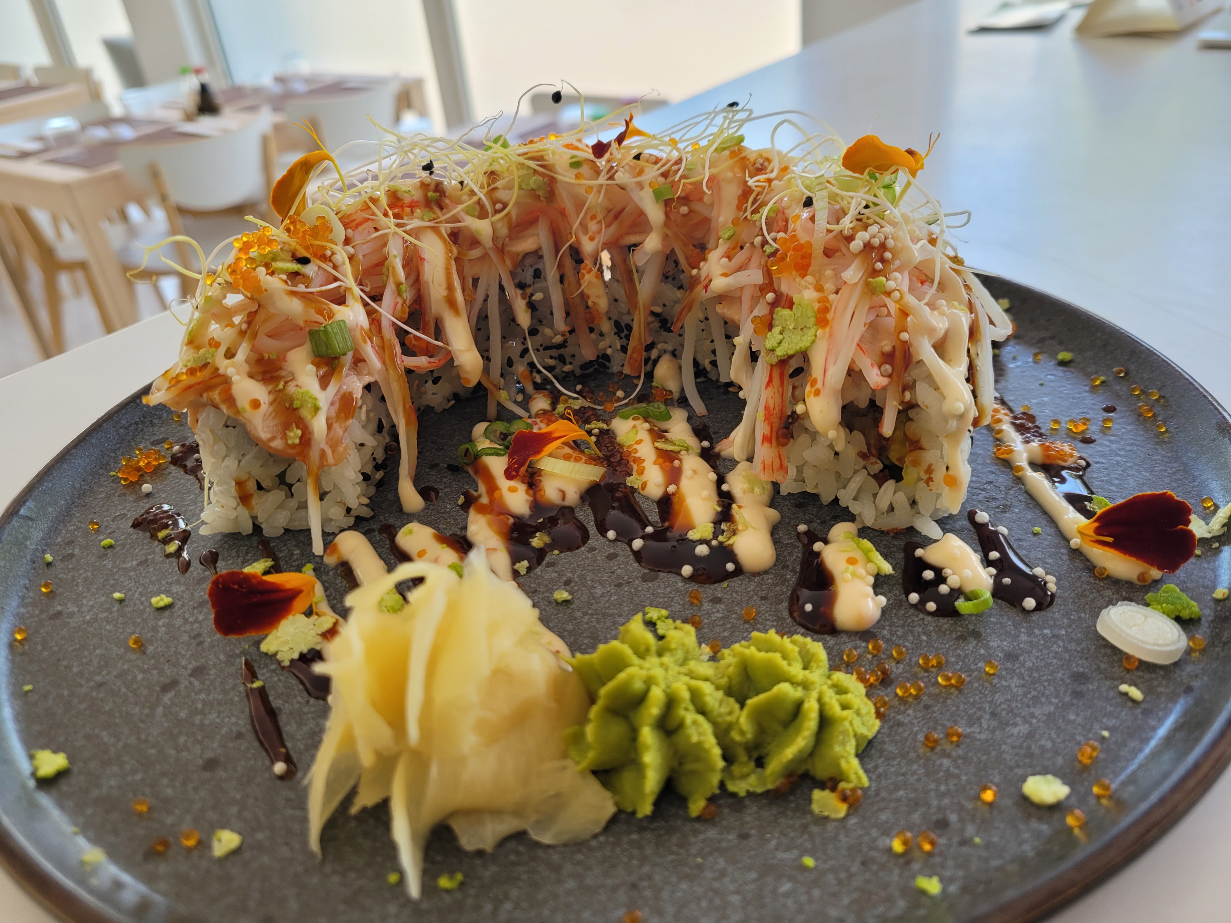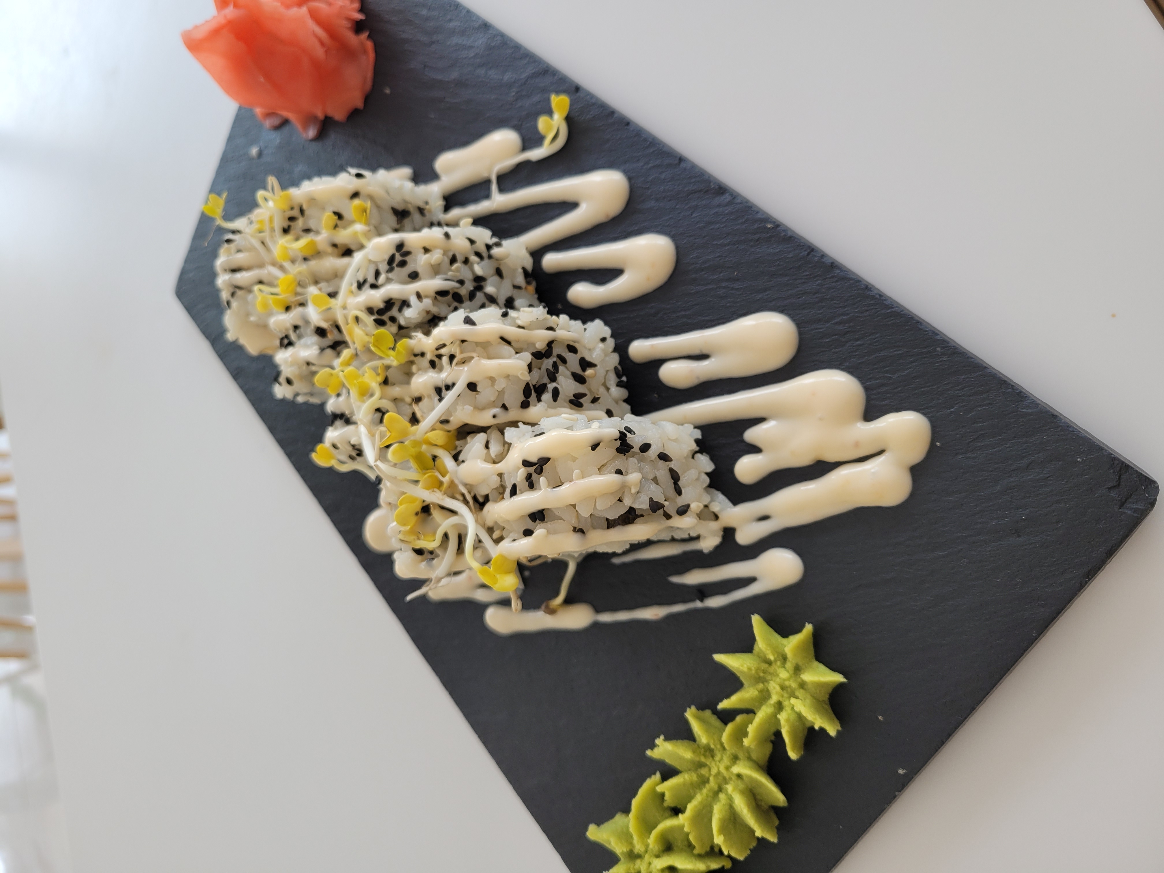 Breaded Shrimps, Avocado, Seared Salmon, Kanikama Sweet Chili Sauce