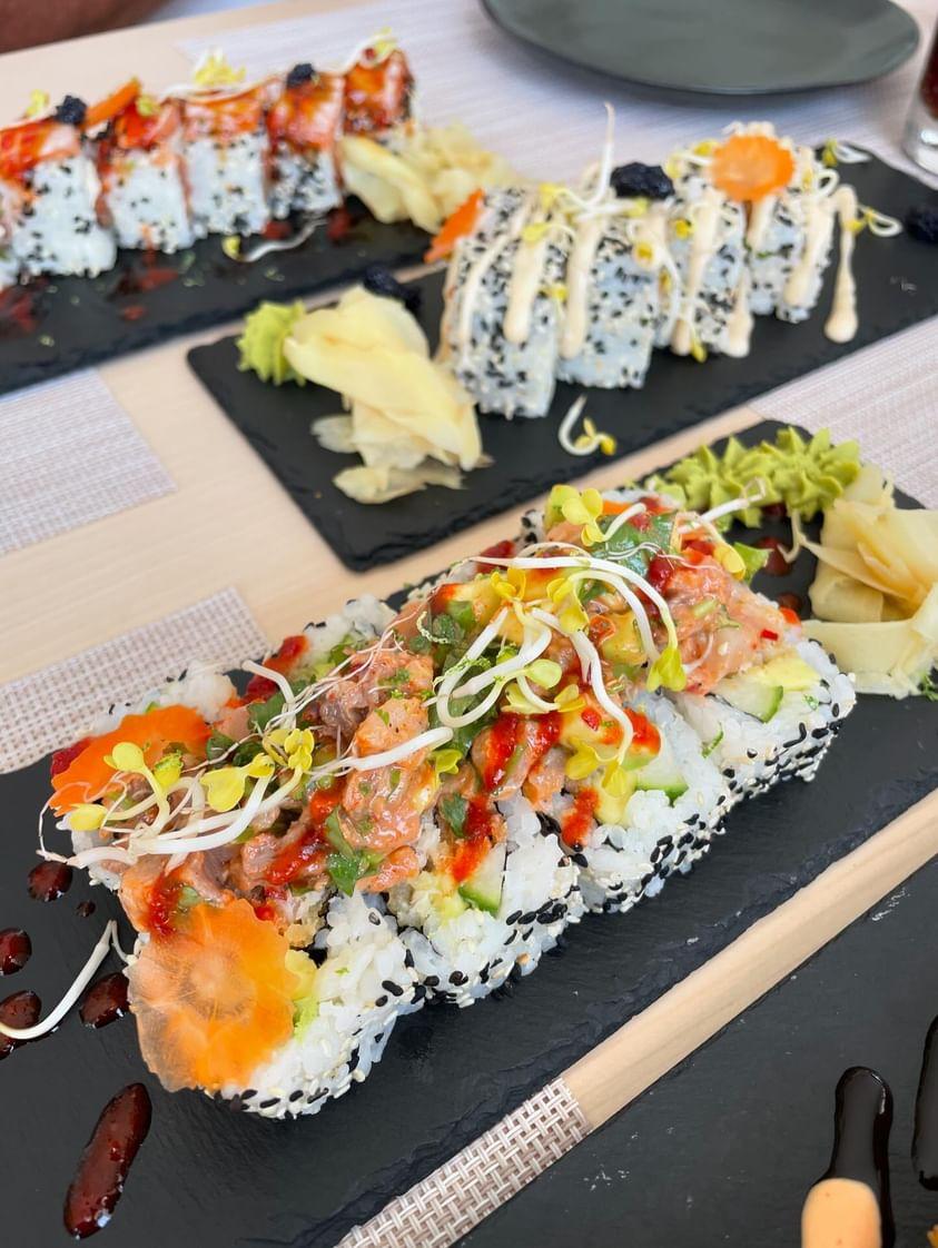 8 California Salmon Avocado, 8 Spring Salmon Avocado, 6 Nigiri Salmon, 2 Yakitori Beef Cheese