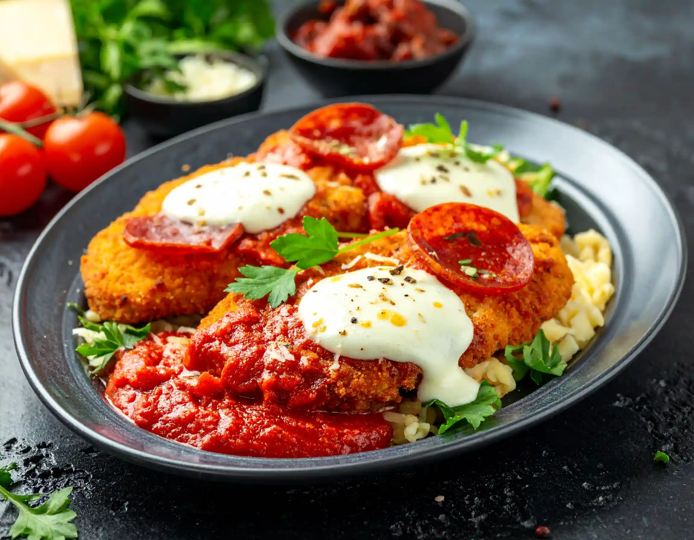 Chicken cutlet, Tomato sauce, Cream, Mozza, Emmental, Pepperoni