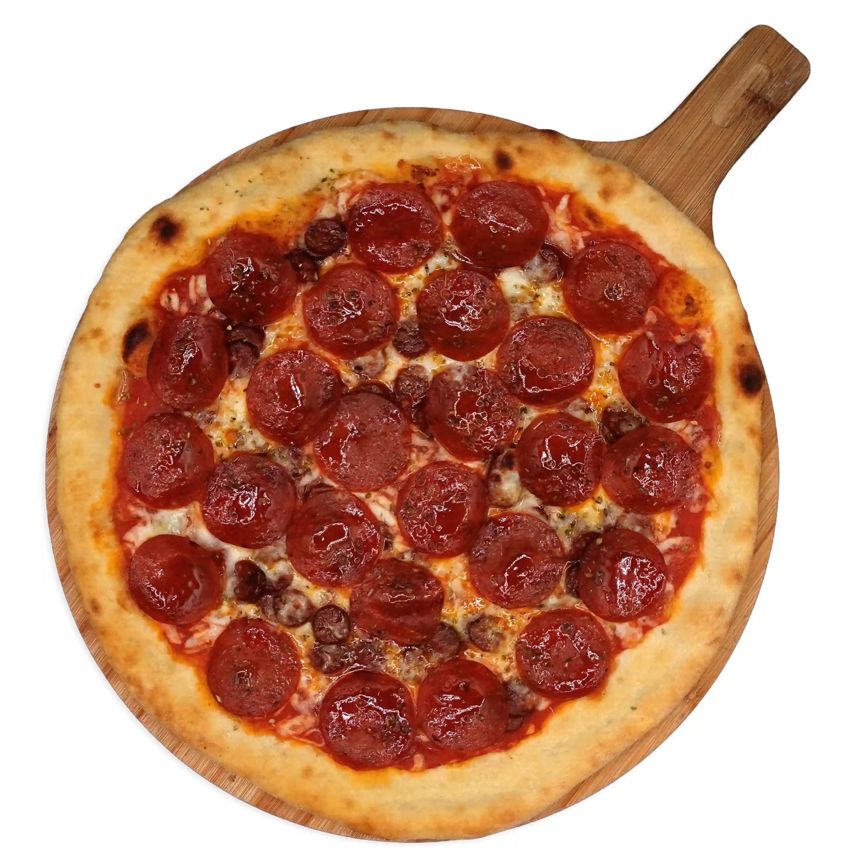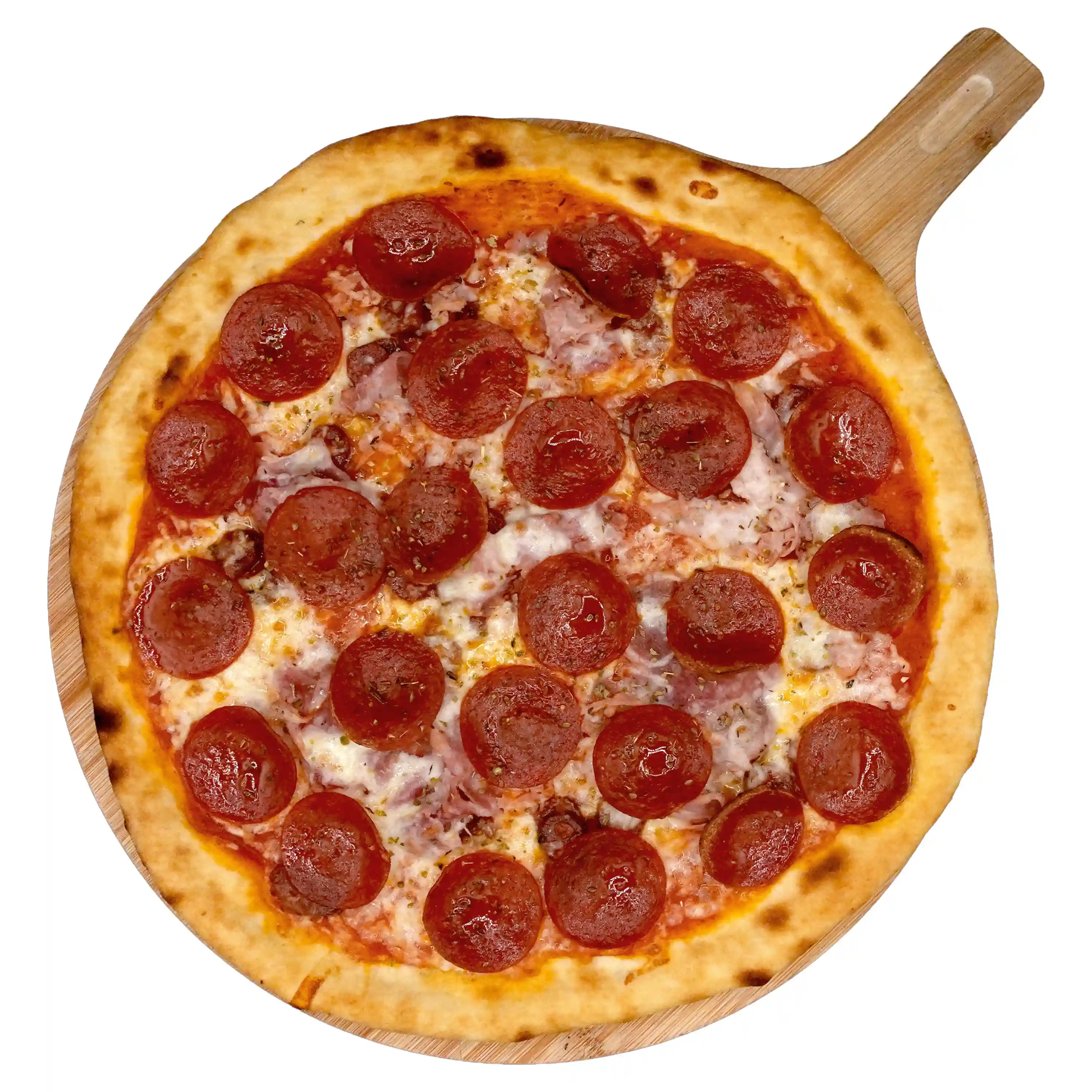 Tomato sauce, Mozza, Emmental, Pepperoni, Merguez, Ham