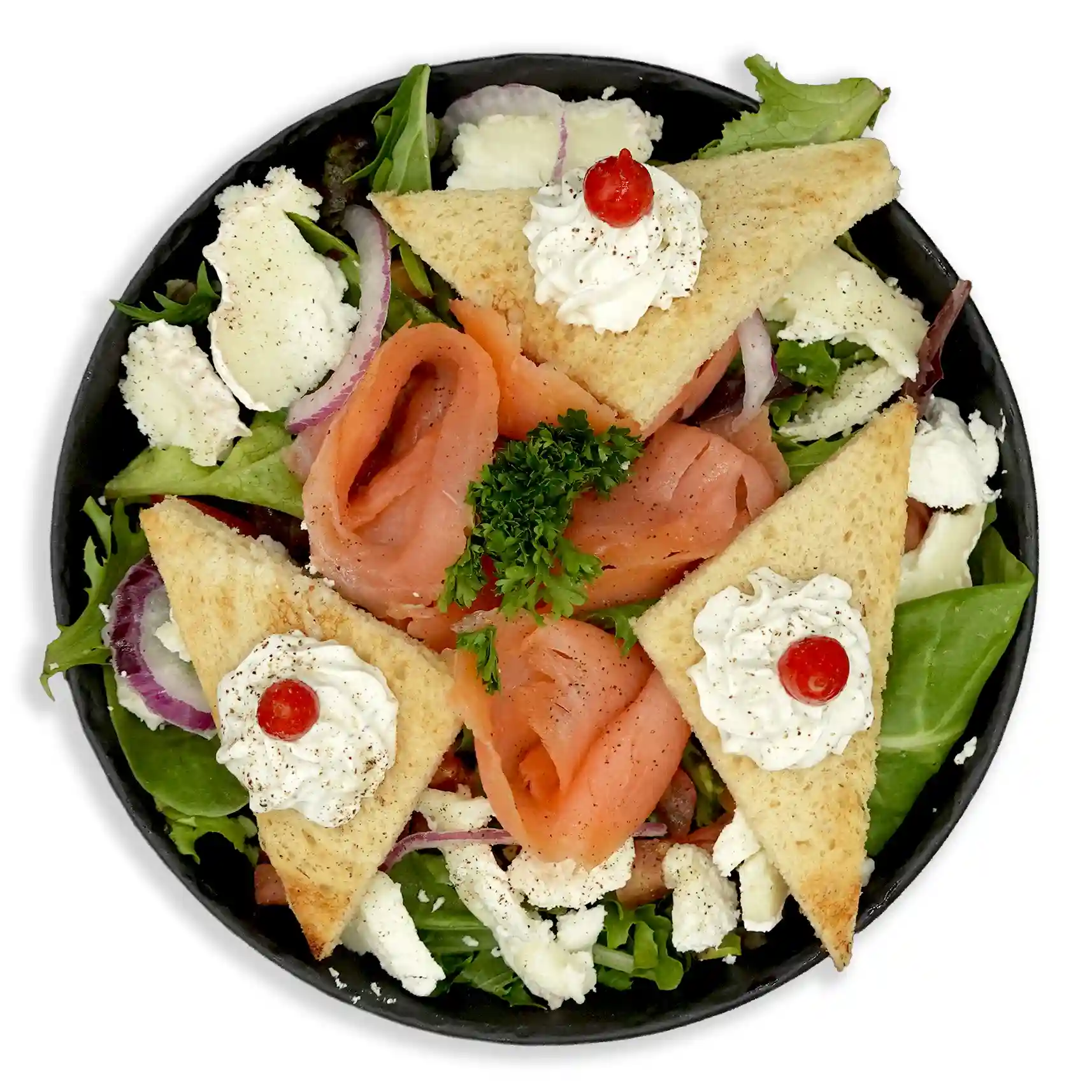 Mesclun, Cherry tomatoes, Shallots, Garlic, Pesto, Smoked salmon, Goat, Pepper drops