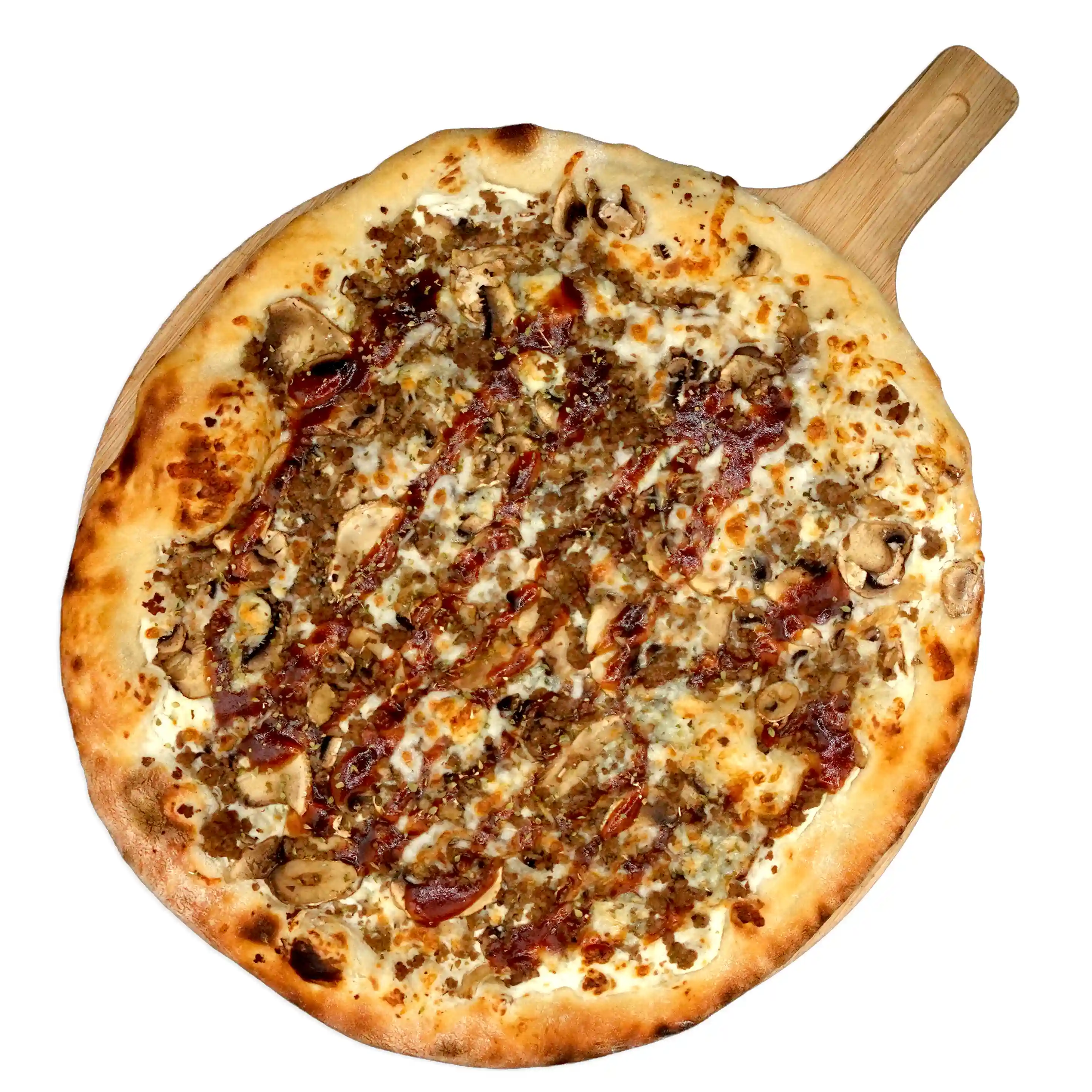 Tomato sauce, Mozza, Emmental, Pepperoni, Merguez, Mushrooms, Peppers