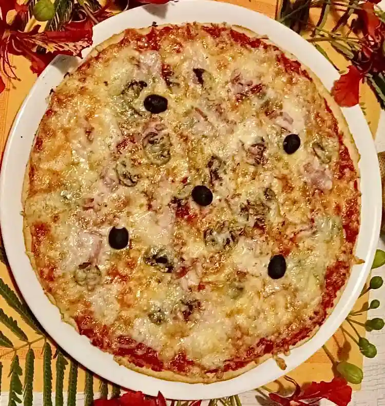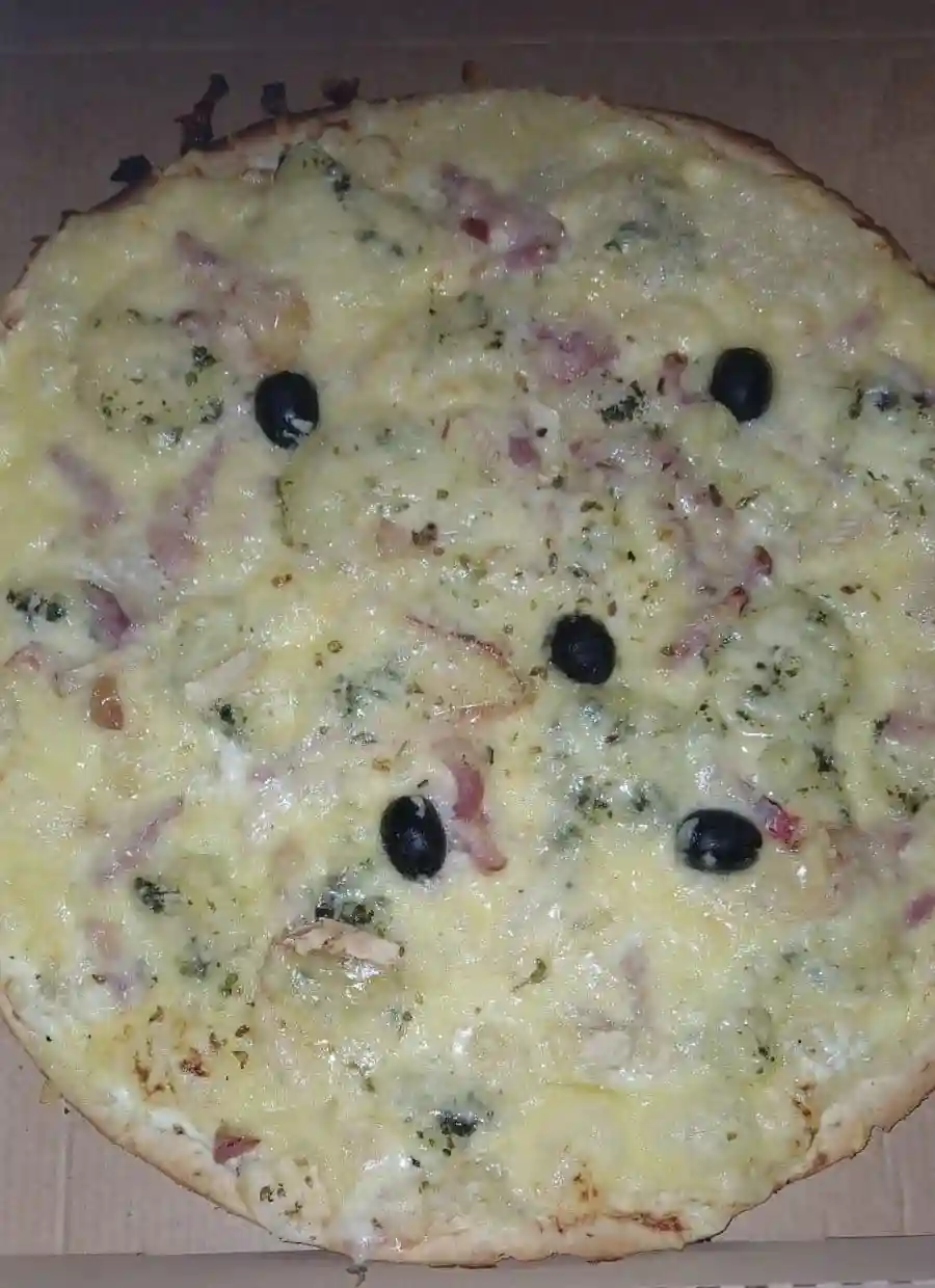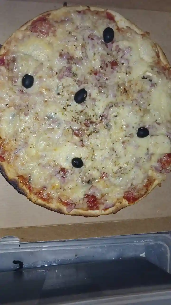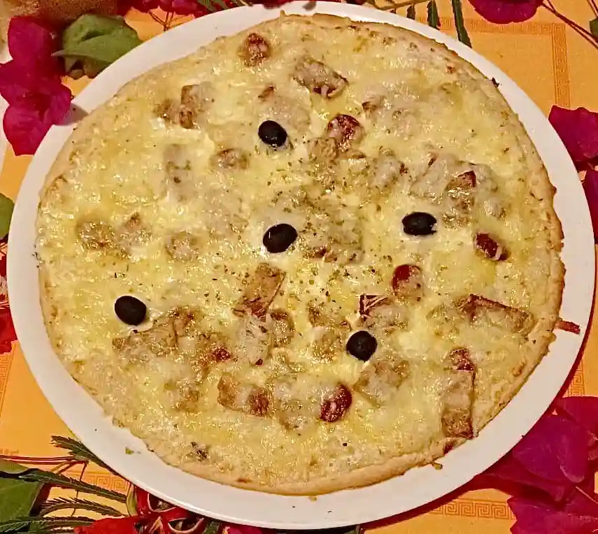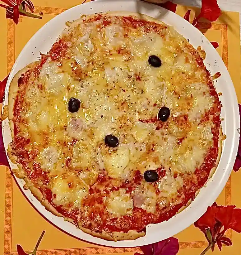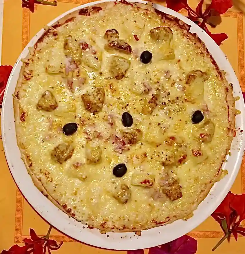 Crème fraîche base, Chicken curry, Pineapple, Lardons, Emmental cheese, Olives, Oregano