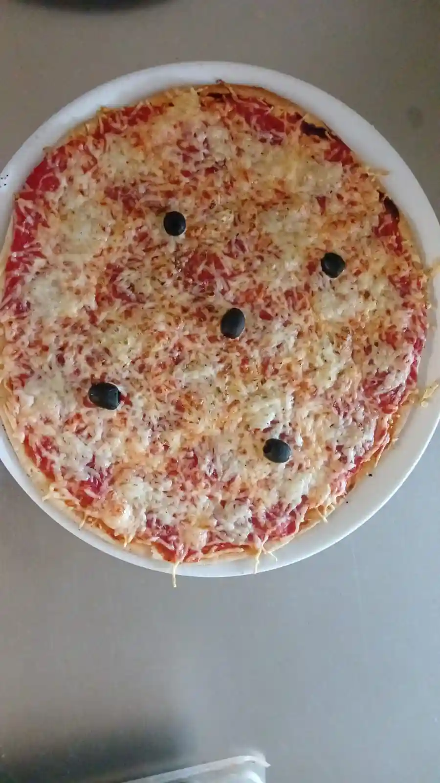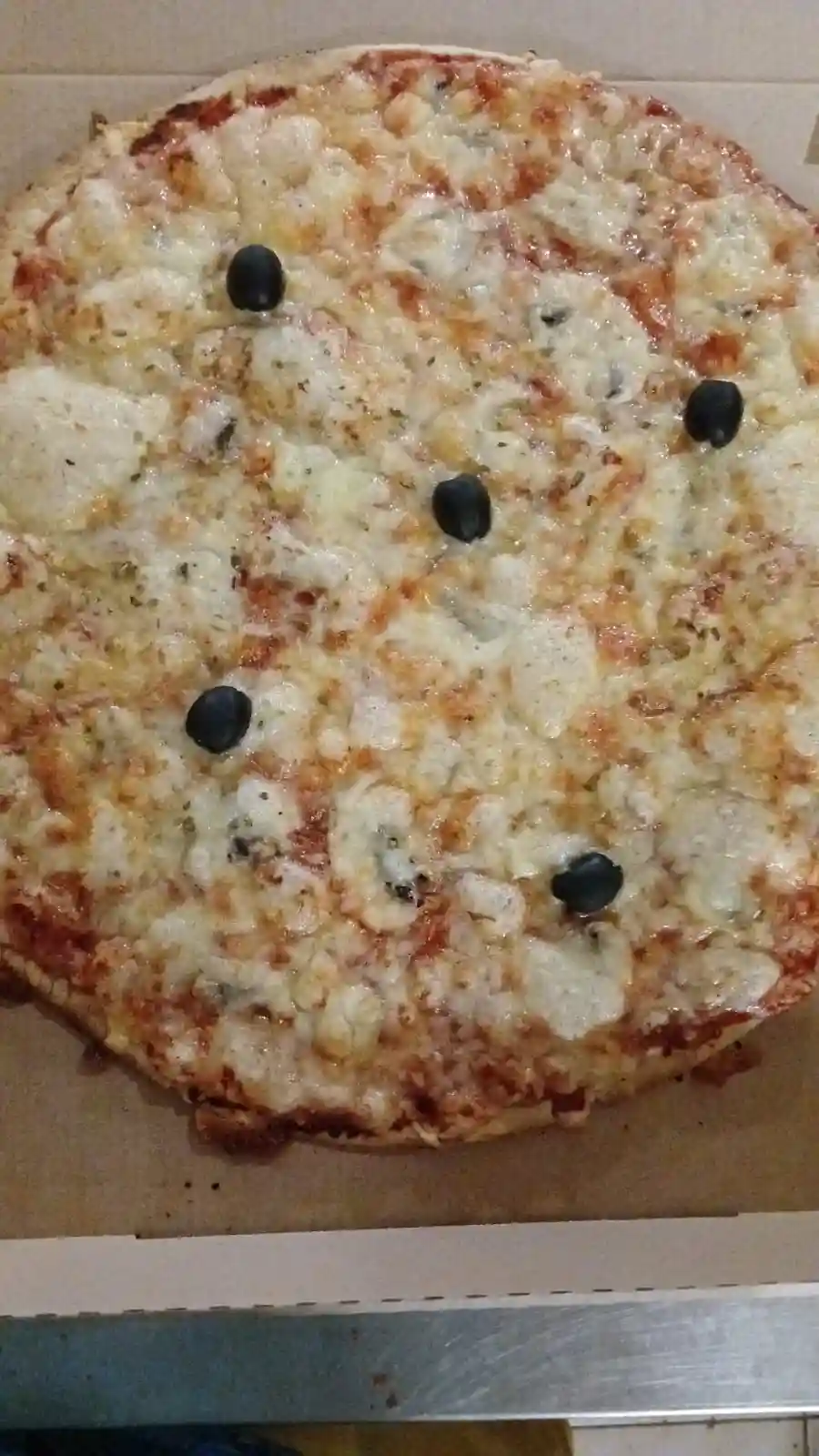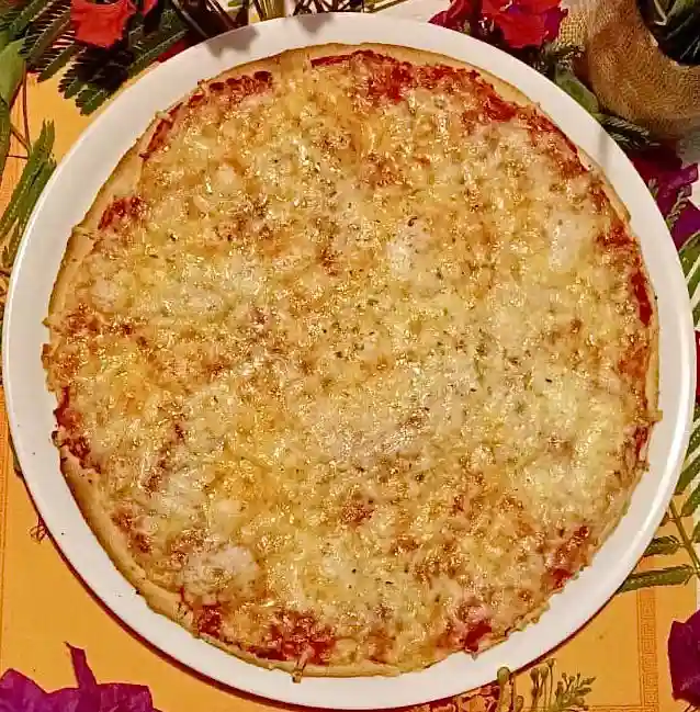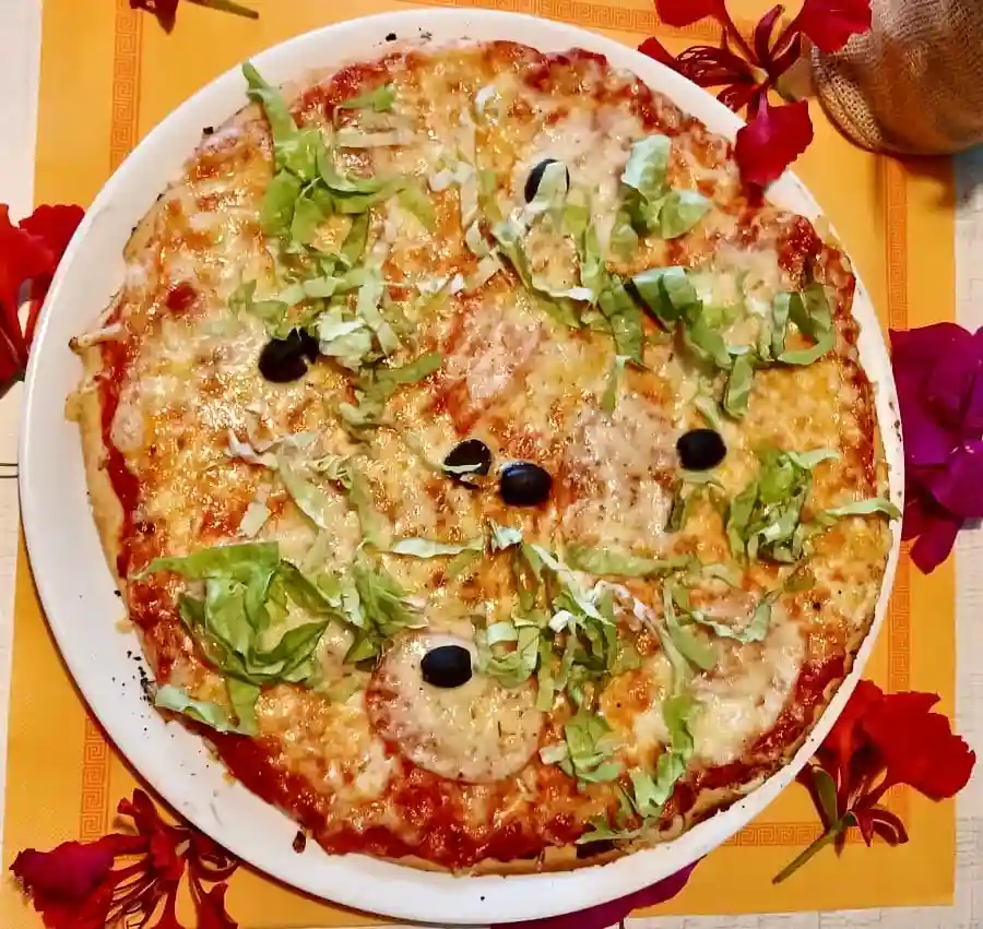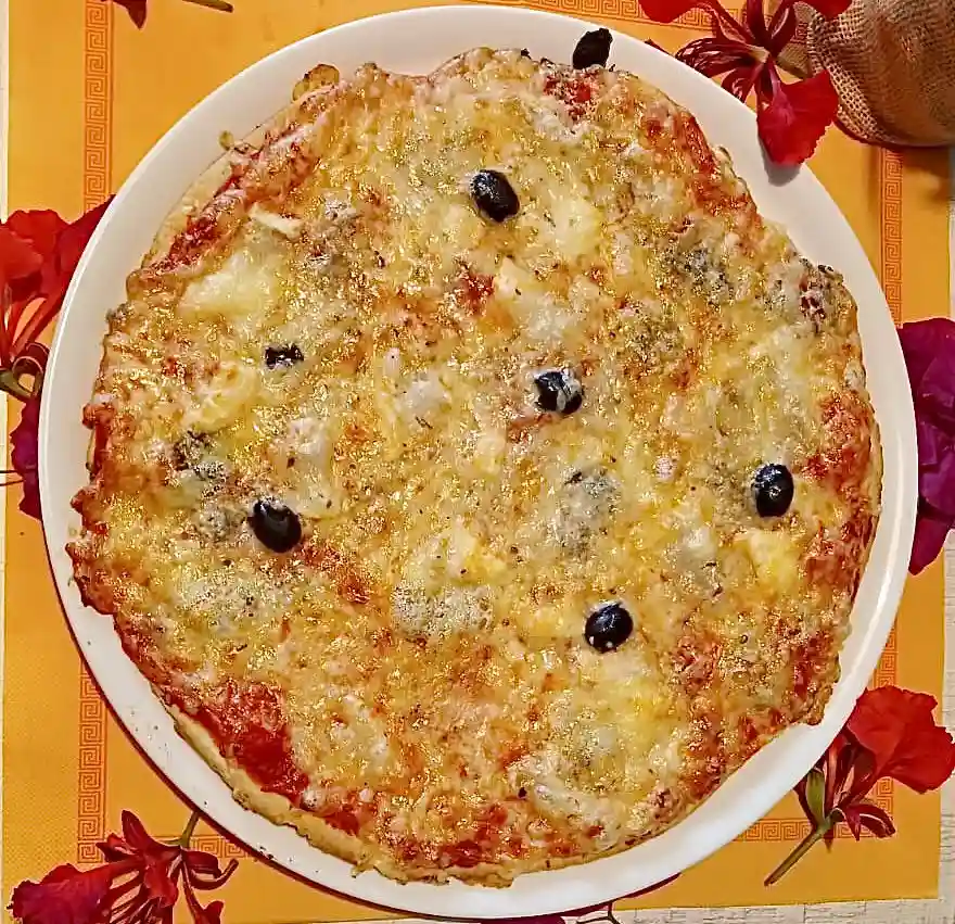 Crème fraîche base, Chicken curry, Pineapple, Lardons, Emmental cheese, Olives, Oregano