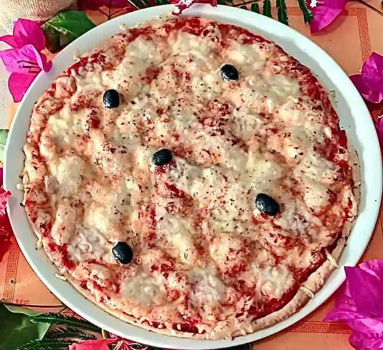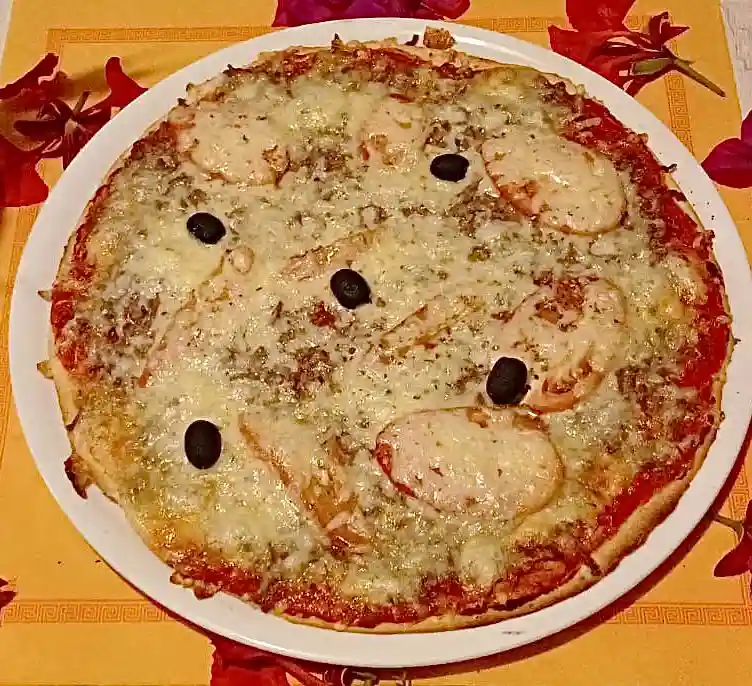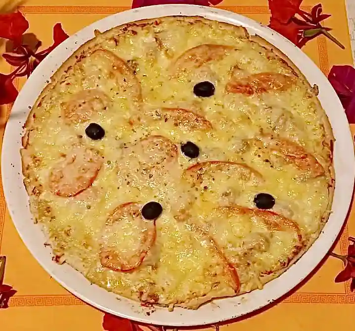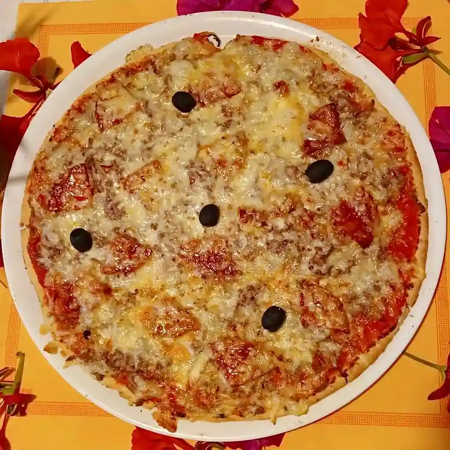 Cream base, Smoked salmon, Fresh tomato, Olive, Oregano