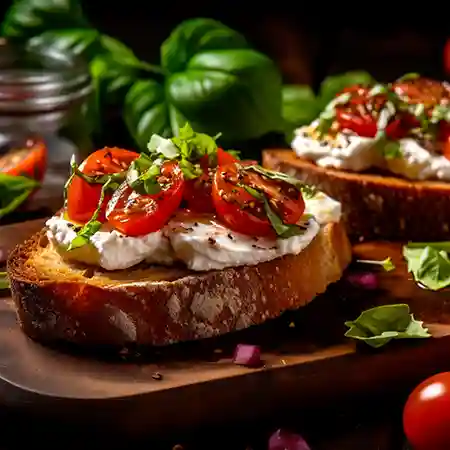 Poulet crispy, tomate, oignons confit, salade, fromage