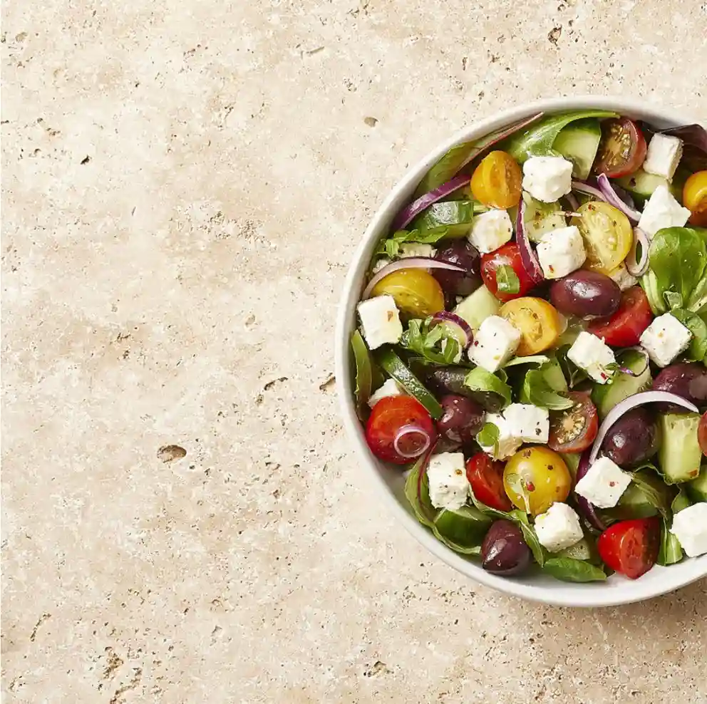 Salad, croutons, tomatoes, red onions, feta cheese, chicken